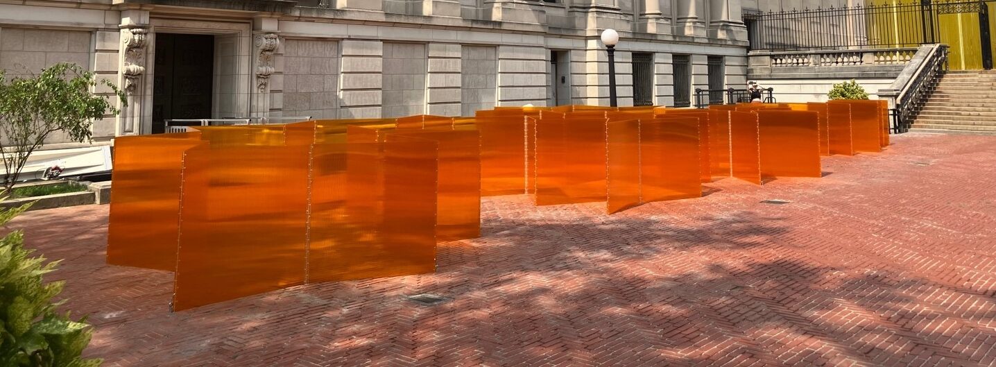 Orange Cube 48 is a folding immersive sculpture made of 66 square panels, measuring 48 x 48 in. (122 x 122 cm.), of translucent 3/8 in. twin-wall polycarbonate, a lightweight material, hinged together like an accordion – that when folded closed, forms a perfect cube. The work transforms a space into a maze that one can enter and walk through, becoming a piece of folding architecture. It is an interactive sculpture that is also an environment, inviting the public to become part of the sculpture – surrounded and contained – as they navigate through it.