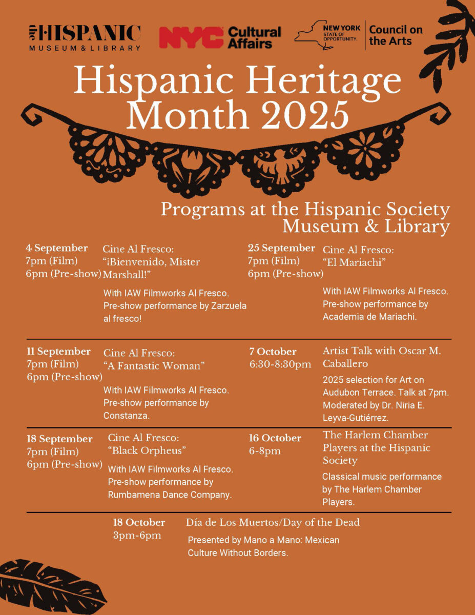 In the United States, Hispanic Heritage Month (September 15 to October 15) celebrates the histories, culturesΒ and contributions of Hispanic Americans whose ancestors came from Spain, Mexico, the Caribbean and Central and South America.Β Each year during Hispanic Heritage Month, the Hispanic Society presents an exciting slate of programming to honor the cultural legacies of Hispanic communities here in the United States and across the world. From film screenings and concerts to our much-loved Day of the Dead celebrations, there is something for everyone.